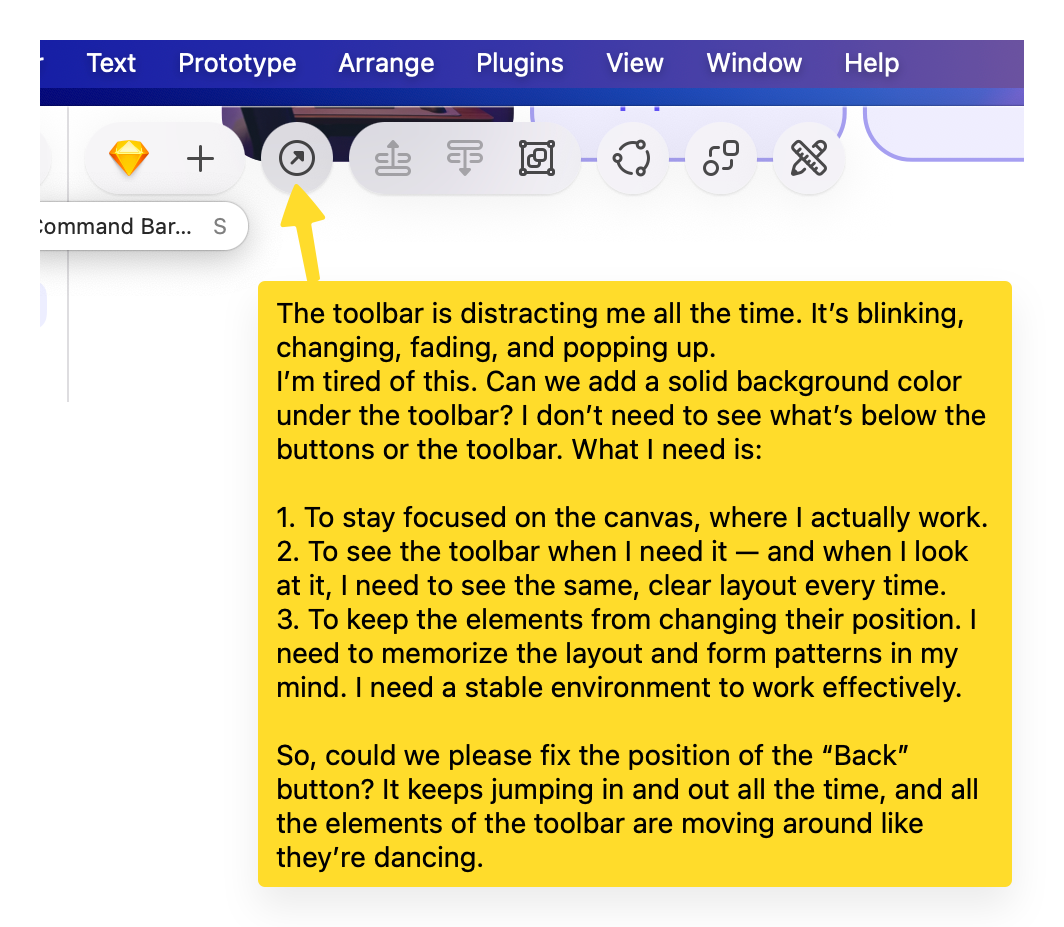 I somehow relied a lot on right-click an element and “Send Backward’ (and using ‘option’ for ‘Send to back’). Now with the extra sub-menu I feel like I’ll have to learn the shortcuts. Kudos for those shortcut working on French Canadian keyboards, something I can’t say of other big design softwares..