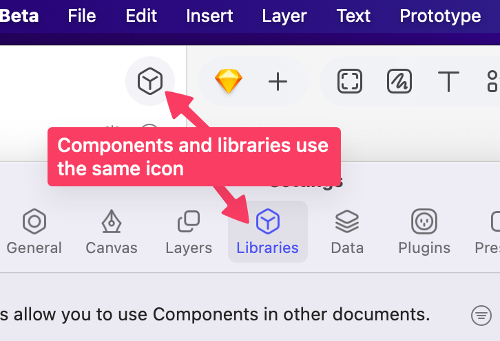 I’ll double-check but I believe the icon for components and Libraries being the same is intentional. Libraries are effectively just documents of components as far as Sketch is concerned.